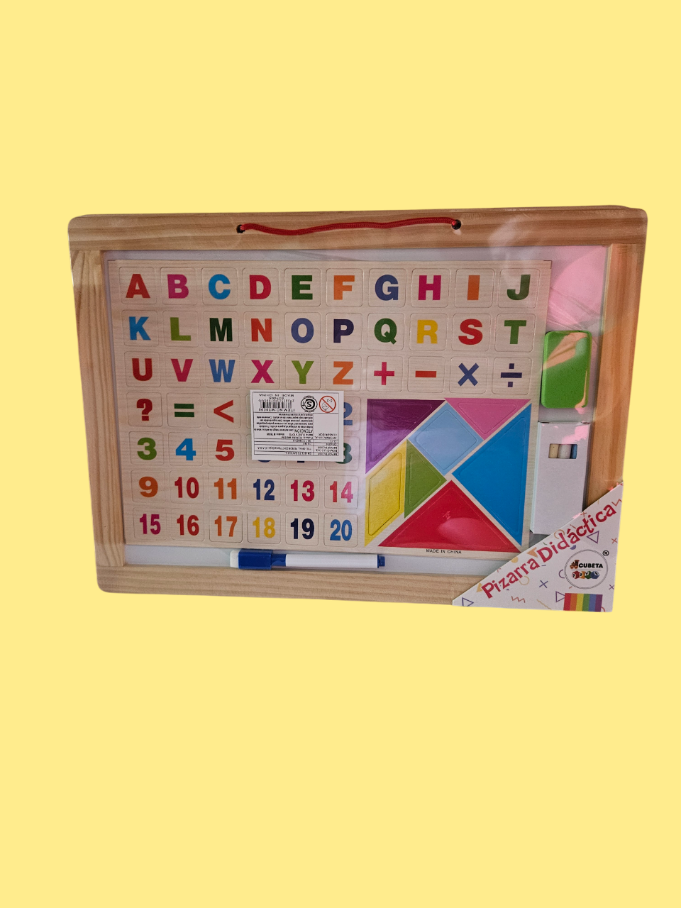 Una pizarra educativa ideal para aprender jugando. Incluye letras, números, signos matemáticos y figuras geométricas de colores, además de piezas tipo tangram para formar distintas figuras. Viene con marcador borrable y superficie imantada, todo en un marco de madera resistente.
